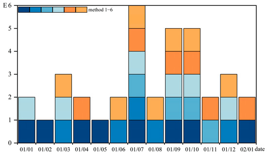 where E represents the weighted sum of DFAA events of the same type. T is the total number of months in the time series. denotes the logical value that indicates whether the method detects DFAA events in month t or not. Generally, a larger indicates that the identification index has a greater ability to generalize results from other identification methods.