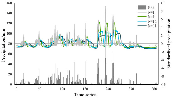 The standardized precipitation under different accumulation precipitation days.