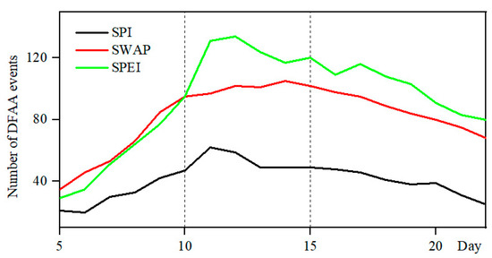 Different numbers of DFAA events were identified by the SPI, SWAP, and SPEI under the influence of different days of antecedent precipitation (Figure 5). The number of recognized DFAA events was relatively stable when the days of antecedent precipitation were 10–15 days. Therefore, we select the appropriate days of antecedent precipitation from 10 to 15 days.