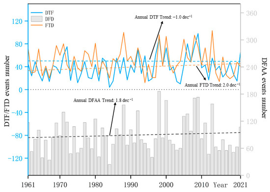 (2) There was an increasing trend in DFAA events at a rate of 1.8/10a between 1961 and 2021. DTF events showed a decreasing trend at a rate of −1.0 event/10a, while FTD events displayed an increasing trend at a rate of 2.0 event/10a. The frequencies of DTF and FTD events demonstrated a gradual increase from the northwest to the southeast.