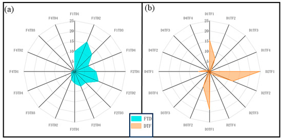 The percentage of (a) FTD events and (b) DTF events in Fujian Province. The values 1, 2, 3, and 4 represent light, moderate, severe, and extreme floods or droughts.
