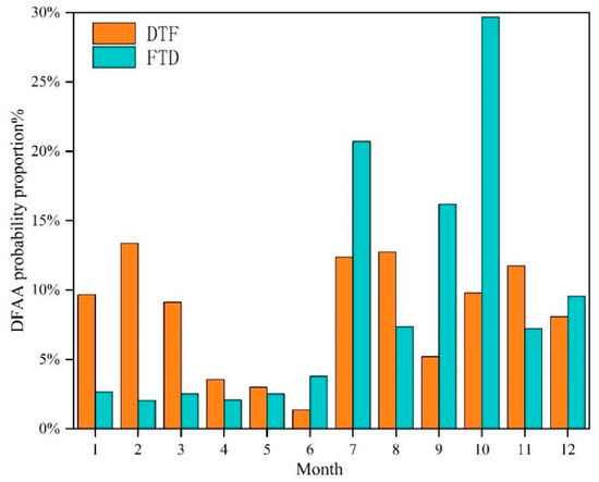 As shown in Figure 8, DTF events in the study area were distributed across the year. There were relatively lower occurrences from April to June, with frequencies of 3.54%, 3.0%, and 1.37%. In contrast, there were relatively more occurrences in February, July, and August, with frequency of 13.37%, 12.37%, and 12.74%, respectively. Additionally, light, moderate, and severe DTF events accounted for 27.70%, 62.18%, and 10.12%, respectively. In terms of DFD events, the percentages of light, moderate, and severe events were 19.58%, 64.57%, and 15.85%, respectively. The majority of these events occurred in July, September, and October, with October having the highest frequency at 29.68%. Moreover, 37.42% of the severe FTD events occurred in October.