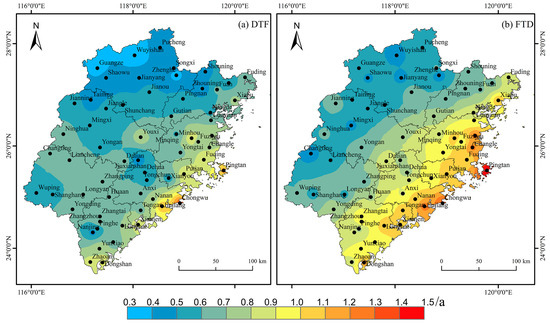 The spatial pattern of the frequency of DTF (a) and FTD events (b) in Fujian Province from 1961 to 2021.
