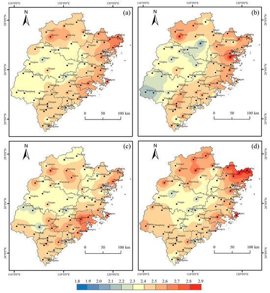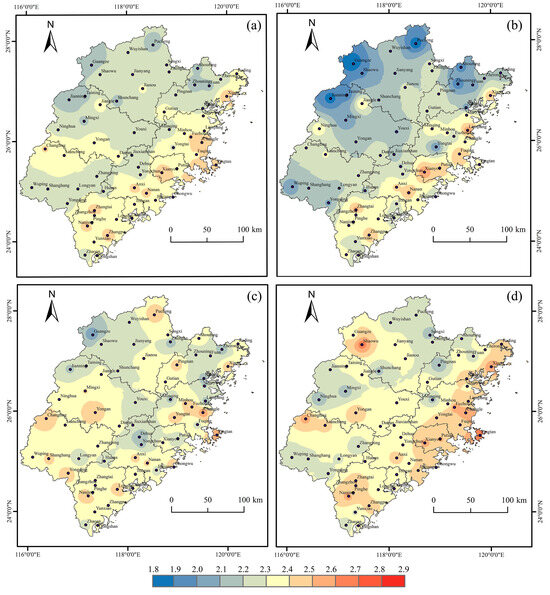 The study period was divided into three intervals: 1961–1980, 1981–2000, and 2001–2021, and the mean intensity of DTF events for these time periods is shown in Figure 11. In Figure 11a, the mean intensity of DTF events in Fujian Province from 1961 to 2021 primarily falls within the range of 2.1 to 2.5, indicating that DTF events are mainly characterized by moderate intensity. The spatial pattern reveals a gradual increase from the northwest (2.1–2.3) to the southeast (2.3–2.5). Additionally, the intensity of DTF events exhibits an upward trend during 1961~1980 and 1981–2021, The most significant change in the intensity of DTF events was found in the northern, western, and eastern regions, followed by the southern areas. In the northern and western regions, the intensity of DTF events at most stations ranged mostly between 2.1 and 2.3 from 1961 to 1980. From 1981 to 2021, it increased to 2.4 in most stations, and it increased to 2.5 in some specific stations, such as the Changting station in the western region, and the Yongan and Pucheng stations in the northern region. Among them, the most significant increase was observed in the Shaowu station in the northern region, increasing from 1.8 to 2.7. In the eastern and southern regions, the intensity of DTF events increased from 2.3 to 2.4 between 1961 and 1980 and further increased to a range of 2.4 to 2.6 between 1981 and 2021. The most significant increase was observed in the Shouning, Fuan, Zherong, and Fuding stations in the eastern region, where the intensity increased from 2.7 to 2.9.
