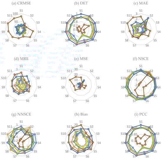 Variation of statistical metrics. (a) centered root mean square error; (b) determination coefficient; (c) mean absolute error; (d) mean relative error; (e) mean squared error; (f) Nash–Sutcliffe coefficient of efficiency; (g) normalized Nash–Sutcliffe coefficient of efficiency; (h) percent bias; (i) Pearson’s correlation coefficient; (j) root mean square deviation.