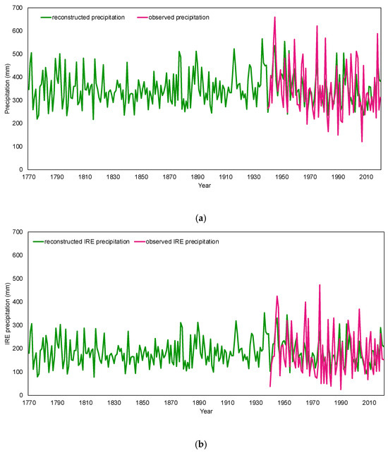 Total precipitation (a) and IRE precipitation (b) during 1940–2020 (observed, purple lines) and 1770–2020 (reconstructed, green lines). IRE Precipitation accounts for 52% of the total precipitation during the observed instrumental period and 52% during the reconstruction period.