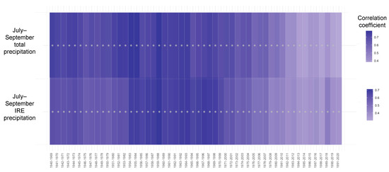 Despite interannual variability, IRE precipitation and total precipitation have no significant (p < 0.05) trend with time (year) during the observed study period of 1940–2020. Further, the correlation between total precipitation and IRE precipitation remains significant (p < 0.05) with the combined pine adjusted latewood chronology during each of the evolving 30-year windows of 1940–2020 except for the most recent 1991–2020 window for IRE precipitation (Figure 2). The mean correlation of the 52 30-year moving windows between adjusted latewood and total precipitation is 0.620, while the mean correlation between IRE precipitation and adjusted latewood is 0.577 (Table 2, Figure 2).