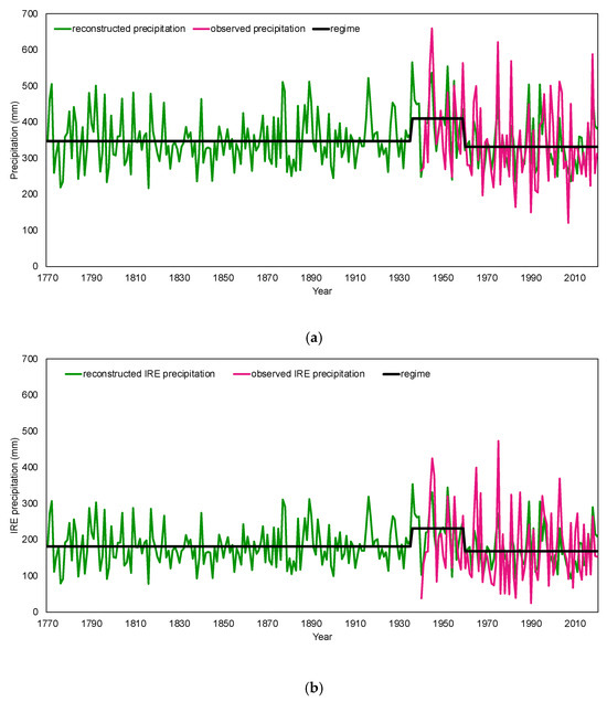 Total precipitation (a) and IRE precipitation (b) reconstructions with significant regime shifts (black line, 1770–1935, 1936–1959 (above-average moisture), 1960–2020 (below-average moisture)) during 1770–2020. The IRE:Total precipitation ratio varies over time with the regime shifts, with values of 52.2% (1770–1935), 56.2% (1936–1959), and 50.8% (1960–2020).