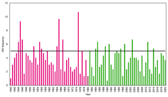 IRE frequency (Y-axis) per year (X-axis) during 1940–2020. During the early analysis period of 1940–1980 (purple bars), IRE frequency exceeded the 5 IREs/summer threshold (black line) 10 times, whereas during the late period of 1981–2020 (green bars), IRE frequency exceeded the threshold (black line) 9 times, with smaller maximum values.