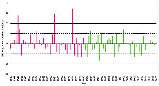IRE frequency standard deviation (Y-axis) per year (X-axis) during 1940–2020 and standard deviation thresholds of +/−2.00 (solid black lines) and +/−1.00 (dashed black lines). During the early analysis period (1940–1980, purple bars), IRE frequency exceeded +1.00 standard deviation on 7 occasions and IRE frequency exceeded +1.00 standard deviation threshold on 5 occurrences during the late analysis period (green bars). IRE frequency exceeds the +2.00 standard deviation threshold on 3 occasions during the early period and on no occurrences during the late period.