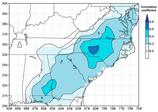 The combined longleaf pine and shortleaf pine adjusted latewood chronology is a viable proxy of historic hydroclimate variability in the Uwharrie Mountains of central North Carolina, USA during the 1770–2020 study period for both intense and total precipitation amounts. To analyze the spatial extent that the proxy represents, we correlated the adjusted latewood chronology with the Climatic Research Unit gridded (i.e., 0.5° × 0.5°) JAS precipitation Time Series (CRU TS) version 4.07 [31] field during 1901–2020 using KNMI Climate Explorer [32]. The chronology has significant correlations (i.e., p < 0.05) with gridded JAS precipitation throughout much of the southeastern US with maximum correlation coefficient values found nearby the study location in the Uwharrie Mountains with significant correlations extending from southern Pennsylvania to northern Florida and from western Tennessee to New York (Figure 6). These results suggest that although the proxy data were collected at one location, the data represent a larger hydroclimate spatial distribution and suggest that future work can incorporate proxy data from other locations (e.g., the northeastern US [33,34]) to produce more robust reconstruction models.