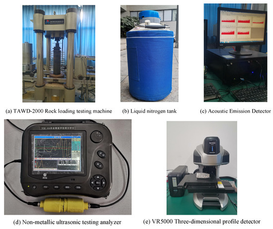 The main equipment used in this experiment includes the domestically produced TAWD-2000 elector-hydraulic servo rock mechanics testing system (Changchun Chaoyang Testing Instrument Co., Ltd., Changchun, China) for uniaxial compression experiments. This system can perform various tests, such as uniaxial, triaxle, direct shear, and creep on rocks, and can calculate various mechanical parameters of rocks. As depicted in Figure 1a, the system comprises three main components: an axial loading system, a computer control system, and a confining pressure loading system. The axial ultimate load capacity of the system is 2000 kN, the confining pressure range spans from 0 to 80 MPa, and the frame stiffness is 500 tf/mm. The axial displacement measurement range is 0–100 mm with an accuracy of ±0.5%, and the circumferential displacement measurement range is 0–5 mm with an error of ±0.3%. The control modes mainly include stress control, strain control, and displacement control, with seamless switching between different control modes. This system can provide a maximum pressure peak of 20 kN and offers high control precision. Pre-stressing is not required during the testing process, and it can automatically reset the contact force and displacement, enabling the acquisition of precise load displacement curves. Additionally, there is a liquid nitrogen tank for cooling rock samples, as shown in Figure 1b; a PIC-2 acoustic emission control and acquisition system for monitoring acoustic emission signals, with a frequency monitoring range of 1 kHz to 3 MHz, as shown in Figure 1c; an NM-4A non-metallic ultrasonic detection instrument for analyzing internal defects in granite samples, as depicted in Figure 1d; and a VR-5000 three-dimensional surface profiler for analyzing the fracture surface morphology characteristics of granite specimens, as shown in Figure 1e.