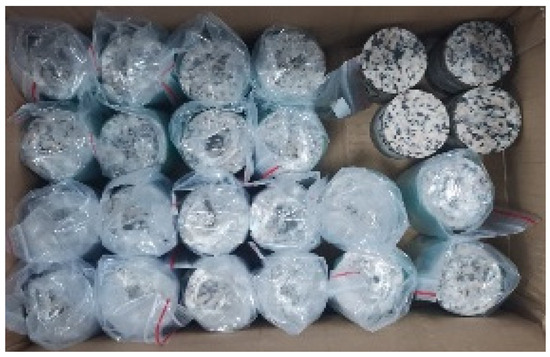 Divide the samples into untreated at 25 °C and 25 °C + LN2, heating to 100 °C + LN2, heating to 200 °C + LN2, heating to 300 °C + LN2, and heating to 400 °C + LN2. There will be two samples for each condition labeled as follows: 25–1 untreated, 25–2 untreated, 25–1, 25–2, 100–1, 100–2, 200–1, 200–2, 300–1, 300–2, 400–1, and 400–2. The granite sample is shown in Figure 2. High-temperature heating refers to heating the sample to the set temperature and then continuing to heat for 3 h to ensure that the inside and outside of the rock sample reach the set temperature. The high temperature will be set at 300 °C, and no heating will be performed for the room temperature group. Liquid nitrogen cooling refers to completely immersing the heated rock sample in a liquid nitrogen container for three hours. At the same time, the rock heated after will be placed in the liquid nitrogen container, and the rock sample will boil with the liquid nitrogen, so the liquid nitrogen should not be filled too full. After the cooling is completed, the next step of the experiment will be conducted.