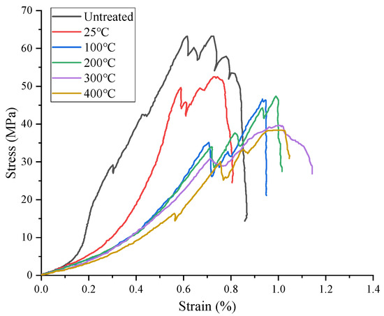 Absolutely, the stress–strain curve is crucial for evaluating the stability and seismic performance of rock. By analyzing this curve, researchers and engineers can assess the potential for rock mass instability, identify critical failure points, and design appropriate mitigation measures. This information is particularly valuable in geotechnical engineering projects, where accurate stability evaluations are essential for ensuring the integrity and safety of structures built on or within rock formations. Figure 3 shows the stress–strain curves at different temperatures under uniaxial compression. In the specific case of granite, the stress–strain curve exhibits four distinct phases: the compaction phase, elastic deformation phase, plastic deformation phase, and ultimate failure phase. During the compaction phase, the physical and mechanical characteristics of the rock deteriorate due to the presence of microscopic structures like pores, cracks, and joints. As the applied load progressively rises, the rock transitions into the elastic deformation phase, where it exhibits linear elastic properties with minimal changes in its microstructure.