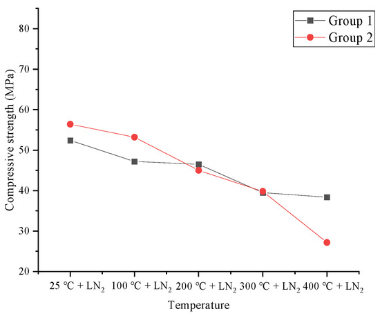 Furthermore, the findings depicted in Figure 4 also demonstrate that the application of liquid nitrogen treatment significantly affects the compressive strength of rock specimens at different heating temperatures. The observed fluctuations in compressive strength suggest that the cooling treatment affects the internal structure and composition of the rock, leading to changes in its mechanical properties. Specifically, for samples treated with liquid nitrogen, a decrease in compressive strength is observed at 100 °C and 200 °C, which suggests a reduction in the load-bearing capacity of the rock. This could be attributed to the thermal shock induced by the cooling process, which might cause microcracks or other defects within the rock. As the temperature increases to 300 °C, there is a certain degree of increase in compressive strength. This suggests that the cooling treatment could induce a rearrangement of the crystal structure or enhance the interparticle bonding, resulting in an improvement in the rock’s resistance to failure. Interestingly, at 400 °C, there is a further increase in compressive strength, which may indicate the presence of a critical point or threshold temperature; beyond this point, the mechanical properties of the rock undergo significant alterations. This observation highlights the importance of considering the specific cooling treatment conditions when evaluating the impact of liquid nitrogen treatment on the compressive strength of rock samples.