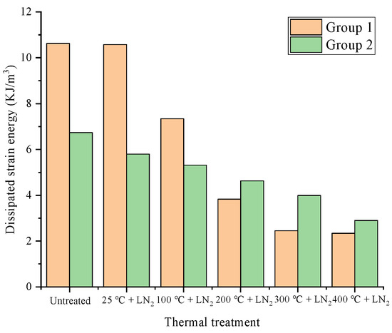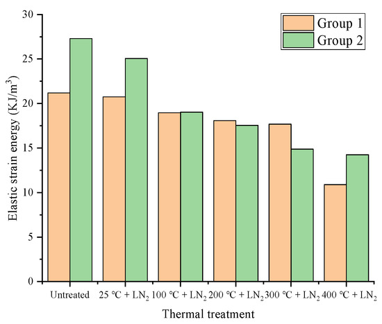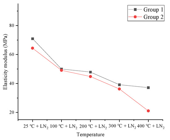 In Figure 5, it is evident that as the treatment temperature increases, the elastic modulus of the rock generally shows a non-linear decreasing trend, except for group 1, where there is a slight increase in elastic modulus at 200 °C and a sharp change in elastic modulus after the temperature rises to 200 °C. Both samples exhibit this trend, with the elastic modulus of group 1 decreasing from 60.15 MPa to 42.22 MPa and the elastic modulus of group 2 decreasing from 43.98 MPa to 25.82 MPa. This indicates that the greater the temperature difference during liquid nitrogen treatment, the greater the change in elastic modulus, indicating that temperature affects the ability of liquid nitrogen to resist rock failure, which is basically an increasing trend.
