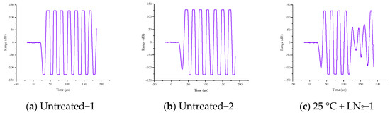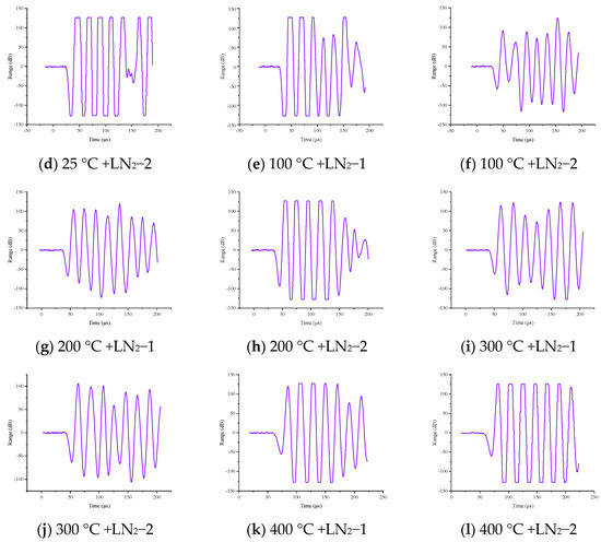 Figure 10 shows the ultrasound time domain characteristics. By comparing Figure 10a–d, it can be observed that the ultrasound time domain spectra of the rock samples, which were not treated with liquid nitrogen and subjected to the same temperature, exhibited minimal changes. The reflection images of the ultrasound waves remained uniform, with no significant variations. The dwell time when the amplitude reached its peak was relatively consistent, and the intervals between each reflection form were also relatively uniform.