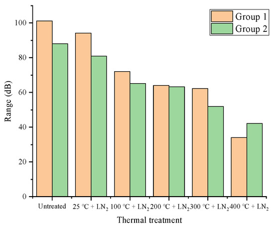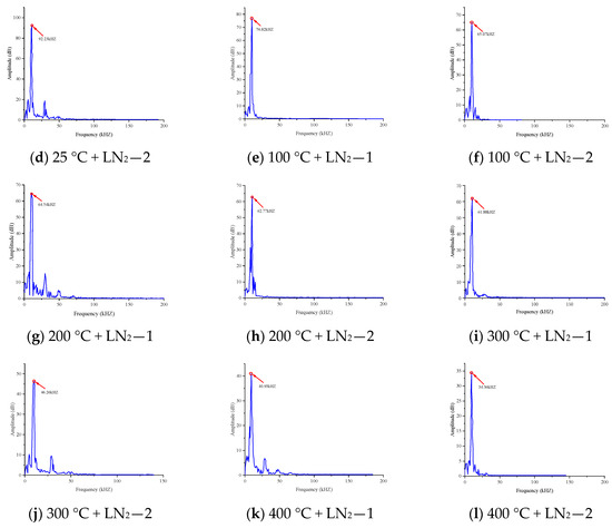 It is observed that the ultrasonic frequency spectrum of the treatment of rock samples with liquid nitrogen can induce changes in their properties as a result of the extreme temperature. The same characteristic is seen in the main frequency, which remains around 12.5 kHz and does not deviate with increasing temperature. It can be seen that the image in group 1 has only one main frequency peak, with other small peaks not being very prominent. As the temperature increases from 25 °C to 400 °C, the maximum peak value of the main frequency in group 1 changes to 65 dB, 75 dB, 35 dB, 90 dB, and 65 dB, respectively, showing different degrees of variation. In group 2, not only is there a main frequency peak at 12.5 kHz, but there is also a small peak at 25 kHz. The maximum peak value of the main frequency changes with temperature from 25 °C to 400 °C as follows: 80 dB, 40 dB, 65 dB, 65 dB, and 90 dB. In particular, in group 2, the images of the rock samples with the smallest main frequency peak values at 200 °C and 300 °C show small peaks that tend to be flat, indicating that changes in temperature gradient also have significant effects on the transmission of signals within the rock samples.