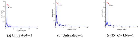 Comparing the graphs in Figure 12, it is observed that the main frequencies all occur around 12.5 kHz, exhibiting multiple sharp peaks and waveforms, reflecting a narrow pass band and narrow bandwidth corresponding to the superimposed signals. The low-frequency components of the initial wave are relatively minimal. When compared with samples treated with liquid nitrogen, it is noted that there is no significant deviation in the main frequency. However, a change in the sharpness of the small peaks around 25 kHz is observed. After 50 kHz, there is almost no discernible signal. Upon comparison within the samples, it is found that the processed signal in group 1 has a maximum amplitude of 65 dB, while the unprocessed sample has a maximum amplitude of 100 dB. In group 2, the unprocessed and processed samples have maximum amplitudes of 85 dB and 35 dB, respectively. The comparison within both samples shows a decrease in the maximum amplitude, indicating that liquid nitrogen affects the internal structure of the rock, leading to signal attenuation.