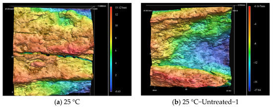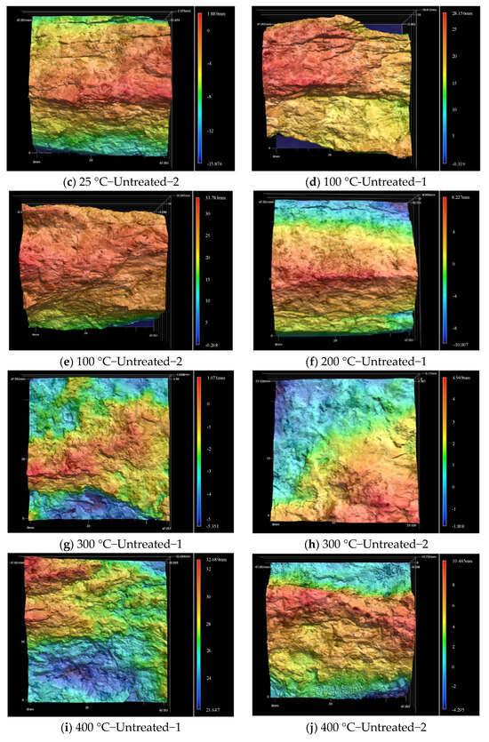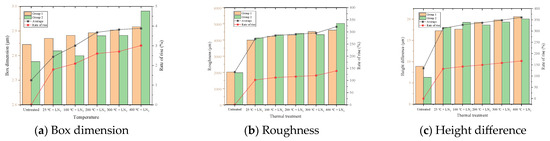 Figure 15 shows the box dimension, roughness, and height difference of the cracked surface of granite after high-temperature liquid nitrogen treatment. According to the data in Figure 15, it can be concluded that liquid nitrogen treatment has an impact on the morphological characteristics of the specimens, leading to increased internal cracks and decreased pore width. More specifically, the fractal dimension of the samples increases after liquid nitrogen treatment, indicating that the surface morphology becomes more complex. In contrast, the samples treated with liquid nitrogen exhibit more irregular and rough features. Further observation in Figure 15a reveals that as the temperature increases, the fractal dimension of both Sample 1 and Sample 2 gradually increases. The evolution of characteristic parameters in Figure 15b,c shows a positive correlation between fractal dimension and roughness and height difference. This implies that liquid nitrogen treatment leads to a more uneven and rugged fracture surface, resulting in an increased contact area between the crack network and the matrix. It indicates liquid nitrogen treatment can improve the distribution of damage in granite and increase the extent of damage in the rock mass. In addition, the complexity of granite fractures is enhanced, forming a more intricate crack network. This phenomenon improves gas exchange efficiency and has a positive effect on the processing and utilization of granite. It should be noted that increasing temperature differences will accelerate the growth rate of the fractal dimension. In other words, as the temperature difference increases, the impact of liquid nitrogen treatment on the fracture surface morphology of the rock mass will become more significant. Furthermore, when external forces act on the fracture surface, additional damage can influence the propagation of cracks. This increases the complexity of the fracture surface and enhances the randomness of the sample. It is worth mentioning that this is consistent with the previously mentioned ultrasonic measurement results, emphasizing the significant impact of liquid nitrogen treatment on the surface properties of the rock mass.