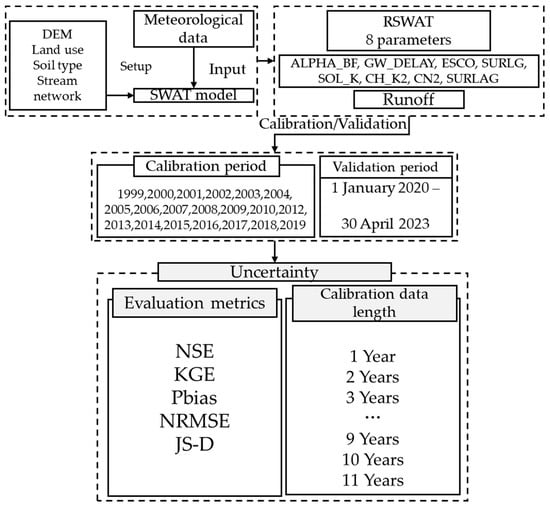 Figure 1 shows the workflow for quantifying the uncertainty in runoff simulations according to the selection of evaluation metrics and calibration data length. First, topographic and meteorological data were constructed to perform runoff simulations using the SWAT model. Then, among the parameters of the SWAT model, parameters related to groundwater, soil, channel routing, etc., were selected to perform SWAT model parameter optimization using the R-SWAT. Next, two forms of uncertainty in the runoff simulations were quantified to (1) analyze the uncertainty as quantified by different evaluation metrics and (2) analyze the uncertainty of simulated runoff according to different calibration data lengths.