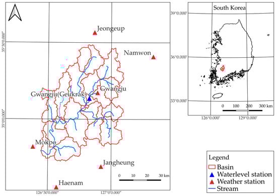 The study was carried out in the Yeongsan River upper basin, located in Korea’s southwestern region, encompassing the latitude bracket of 35.7°–35.5° and the longitude span of 126.4°–127.1°. The basin area is approximately 3371.4 km2 in total, as shown in Figure 2. The region’s average annual temperature is noted to be 14.0 °C with an annual rainfall reaching up to 1293 mm. The region’s landscape is made up of 45.4% forests, 35.5% farmlands, 7.3% urbanized zones, 5.2% grasslands, 3.4% water bodies, 1.8% barren lands, and 1.4% wetlands. The Yeongsan River basin has an average annual runoff of 22.9 m3/s, with a standard deviation of 6.77, and a standard deviation to mean ratio of 0.29, indicating a relatively stable hydrological system. The maximum daily runoff was recorded during the significant Korean Peninsula heavy rainfall event in August 2020, reaching 2917.7 m3/s, and the maximum monthly runoff in August 2020 was 184.5 m3/s. The runoff of the Yeongsan River basin during historical periods is shown in Figure S1. The largest urban region in the study area is Gwangju Metropolitan City, and the water from the Yeongsan River basin is harnessed for irrigation and household needs. Despite its considerable size, the basin is relatively unimpacted by man-made constructions like dams. However, the Yeongsan River does not have sufficient river runoff in the dry season, which has led to frequent extreme droughts, especially in the late 2000s and 2014–2015.