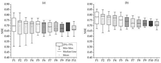 The IQR, which represents the model uncertainty in the calibration period, was the largest for P1 before and after calibration, at 0.122 and 0.100, and the smallest for P11, at 0.030 and 0.024. The shorter the calibration data length, the higher the model performance but the higher the inherent uncertainty of each independent period. The average IQR for the NSE, including all calibration data lengths, decreased from 0.085 to 0.069 after calibration, and showed a decrease in uncertainty.