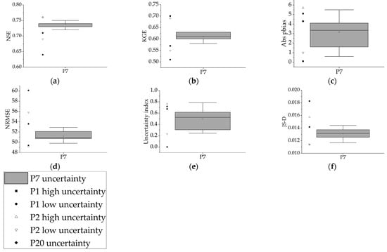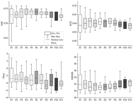 The average value of the absolute Pbias was the lowest in P6 (2.84) and the highest in P8 (4.36), with the highest uncertainty in P8. The IQR of Pbias was the highest in P1 (4.03) and the lowest in P2 and P5 (2.00). NRMSE was the lowest for P5 (51.08), and the IQR was the highest for P1 (3.73). Considering the average, the uncertainty in the NRMSE was the largest for P1 (52.52).