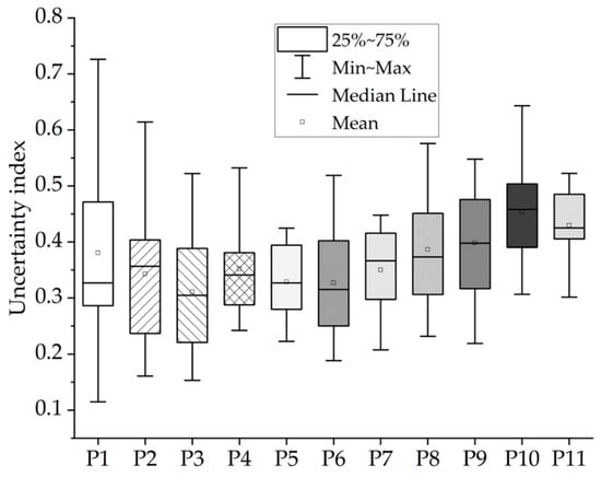 An uncertainty index was then calculated using the four evaluation metrics to quantify the overall uncertainty, as shown in Equation (8):