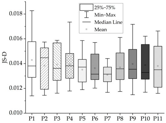 Then, JSD is developed by comparing each distribution to the “midpoint” distribution, , defined in Equation (11):