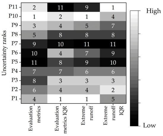 The overall uncertainty rankings are shown in Figure 8. In this matrix chart, a higher ranking—with 1 being the highest—indicates greater uncertainty. Thus, the overall uncertainty was lower for runoff simulations with calibration data lengths of five to seven years, with that of P7 being the lowest. In particular, P7 had the lowest uncertainty according to the calibration data length for the extreme runoff simulations. For a period longer than P7, the uncertainty was higher, but the uncertainty based on the IQR was relatively low. This suggests that there is an optimal length for the calibration period, and an excessive amount of data might have heightened the uncertainty in the runoff simulations.