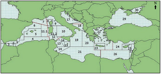 Mediterranean Geographical Sub-Areas (GSAs www.fao.org/gfcm/data/gsas/en/, accessed on 20 October 2023).