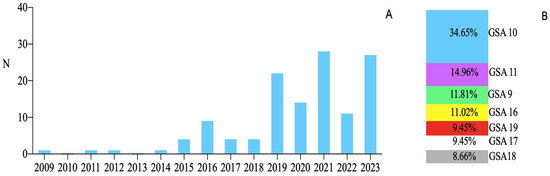 A study conducted during the last fifteen years (2009–2023), showed that the major information source was Google (52%), followed by Facebook (32%), and Instagram (16%). A total of 127 cases involving interactions between marine species and marine litter were documented along the Italian coasts. A significant positive trend (rs = 0.88, p < 0.01) was observed starting from 1% in 2009 and reaching 24% by 2021 (Figure 2A). Most of the cases were reported in the autumn (38%), followed by the summer (26%), spring (23%), and winter (13%). GSA 10 emerged as the area with the highest number of cases (34.6%), followed by GSA 11 (15%), GSA 9 (11.8%), GSA 16 (11%), GSA 17 and 19 (9.4%), and GSA 18 (8.7%) (Figure 2B). However, no significant differences between GSAs were detected (p > 0.05).