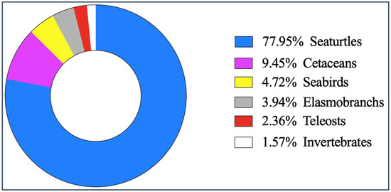 Out of these recorded cases of interaction with marine litter, 16 distinct species were identified (the species are listed in Table S1, Supplementary Materials). Our results showed that 61% of cases were entanglement and 39% were plastic ingestion. Additionally, a single record of concurrent entanglement and ingestion was observed. Marine turtles (78%) were the most affected marine animals, followed by cetaceans (9%), seabirds (5%), elasmobranchs (4%), teleost (2%), and invertebrates (2%) (Figure 3).