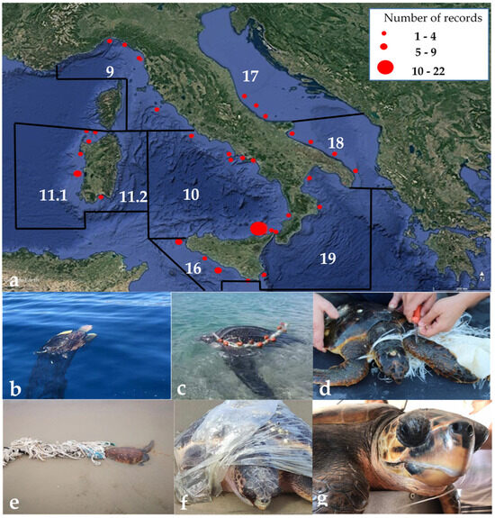 Map of records of marine turtles in Italian GSAs. Small dot from 1 to 4 reported cases, medium dot from 5 to 9 and large dot from 10 to 22 registerd cases. (a). Caretta caretta and Dermochelys coriacea entangled in fishing nets (b,c) [56], C. caretta entangled in plastic packaging (d) [57], in fishing net and ropes (e) [58], in a plastic sheet (f) [59], and C. caretta with fishing line and hook within the digestive tract (g) [60].