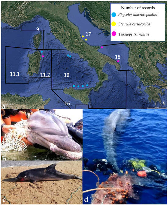 Map of records of cetaceans in the Italian GSAs (a). Examples of plastic entanglement of cetaceans in fishing nets: Tursiops truncatus (b), Stenella coeruleoalba (c), and Physeter macrocephalus (d) [61,62,63].