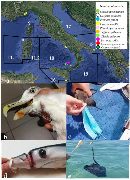 Map of records of seabirds, elasmobranchs, teleost, and invertebrates (a). Larus michahellis entrapped in fishing lines (b), Puffinus yelkouan entrapped in a surgical mask (c), Prionace glauca entangled by a plastic ring (d), Dasyatis pastinaca entangled by fishing lines, and plastic bag (e) [64,65,66,67].