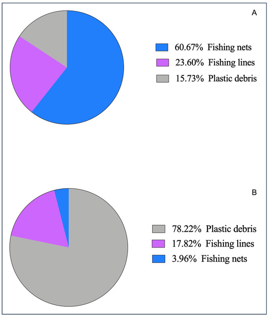 When focusing exclusively on entanglement cases, the predominant litter type was fishing nets, accounting for 46% of the cases, followed by fishing lines at 23%, and plastic debris (15%, mostly consisting of plastic floats, plastic bottles, plastic sheets, and plastic rings) (Figure 7A). Regarding the records of macroplastic ingestion, the dominant category of plastic litter consisted of 75% of plastic debris, which included items such as cups, bottles, filters, food packages, balloons, and balloon strings (Figure 7B).