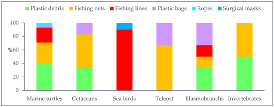 Regarding the health status of the species, 74% of marine animals survived the impact of plastic waste and 24% died, while the health condition of 2% marine animals could not be confirmed. Finally, regarding the environment in which marine animals were found, 72% of cases were found in the sea, while the remaining 28% were on the beach. In Figure 8 the percentage of the type of litter in the studied cases is shown. Fishing nets appear to be the main source of entanglement for cetaceans and teleost; fishing lines are the main source of entanglement for seabirds.