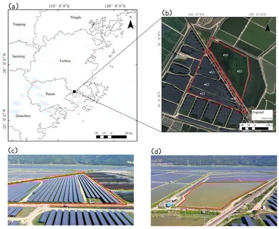 (a) Guoqiaoshan, Fuqing city, Fujian province, China (25°31′48″ N, 119°17′24″ E); the black dot is the location of this study; (b) distribution of sampling stations (S1–S6); (c) overview of the PV area; (d) overview of the control area.