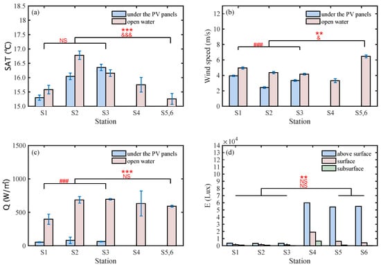Distribution of (a) surface air temperature, (b) wind speed, (c) net total radiation, and (d) light intensity in the Guoqiaoshan aquaculture ponds. In (a–c), the asterisks represent differences between the PV area (S1~3 blue) and the control area (S5, 6) (** p ≤ 0.01; *** p ≤ 0.001); differences between the PV area (S1~3 blue) and the open water in the PV area (S1~3 pink) (### p ≤ 0.001); differences between the open water in the PV area (S1~3 pink) and the control area (S5, 6) (& p ≤ 0.05; &&& p ≤ 0.001). In (d), the asterisks represent differences in the above surface between the PV area (S1~3 blue) and the control area (S5~6 blue) (** p ≤ 0.01). S5,6 indicates that a group of samples are collected on S5 and S6. “NS” represent no significance (p > 0.05).