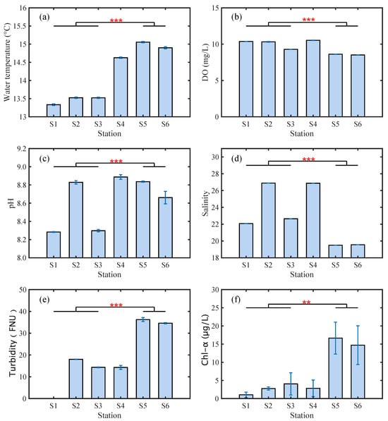 Distributions of (a) water temperature, (b) DO, (c) pH, (d) salinity, (e) turbidity, and (f) Chl-α in the Guoqiaoshan aquaculture ponds. Asterisks represent differences between the PV area (S1~3) and the control area (S5~6) (** p ≤ 0.01, *** p ≤ 0.001).