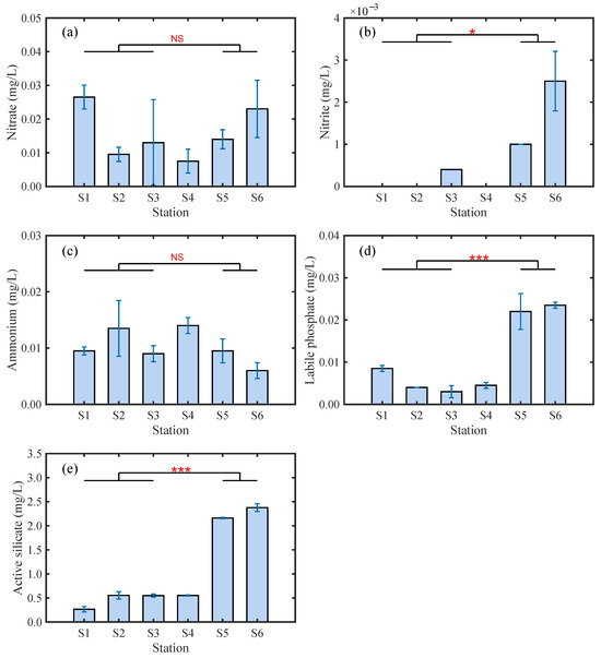 Distributions of (a) nitrate, (b) nitrite, (c) ammonium, (d) labile phosphate, and (e) active silicate in the Guoqiaoshan aquaculture ponds. Asterisks represent differences between the PV area (S1~3) and the control area (S5~6) (* p ≤ 0.05; *** p ≤ 0.001; NS no significance).