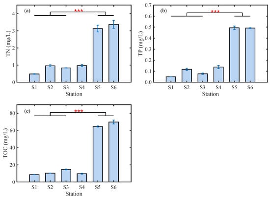Distributions of (a) TN, (b) TP, and (c) TOC in the Guoqiaoshan aquaculture ponds. Asterisks represent differences between the PV area (S1~3) and the control area (S5~6) (*** p ≤ 0.001).