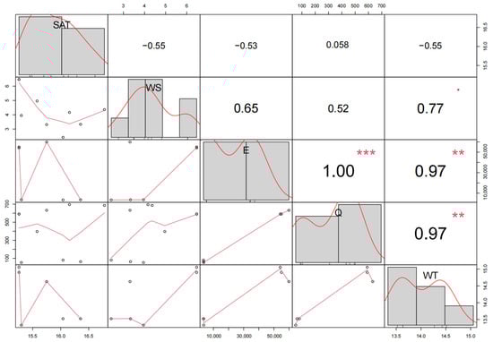 The Pearson correlation analysis results of water temperature and near-surface meteorological parameters are shown in Figure 6. As seen from the figure, water temperature is positively correlated with E and Q (p ≤ 0.01). There is no correlation with SAT or wind speed (p > 0.05). In addition, there is a significant positive correlation between E and Q (p ≤ 0.001).