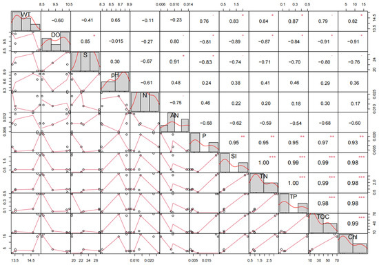 The Pearson correlation analysis results of water temperature and water quality parameters are shown in Figure 7. As seen from the figure, there are significant positive correlations between water temperature and Chl-α, active silicate, TN, and TP (p ≤ 0.05). There are no correlations with the other water quality parameters (p > 0.05).