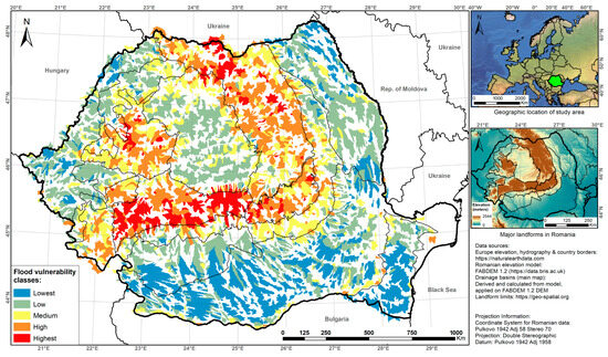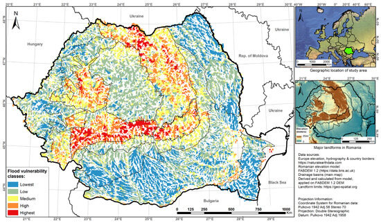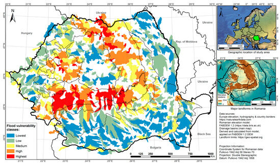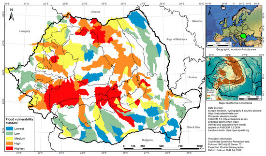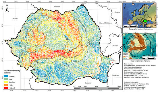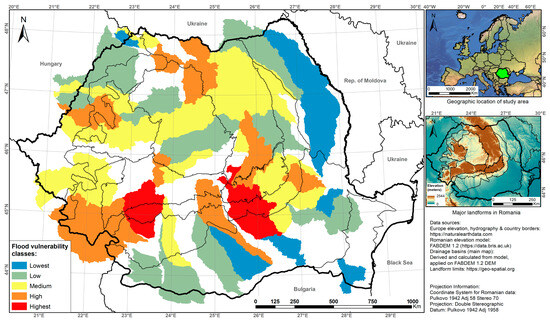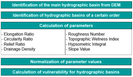 The current study aims to describe a newly developed automated model for comparative analysis of flood vulnerability for drainage basins based on morphometric criteria. This has been achieved according to the drainage basin hierarchy classification system, which was introduced by Horton (1932–1945) [25,26] and modified by Strahler (1952–1964) [27,28,29,30]. The model has been applied to the entire surface of Romania. It calculates morphometric values for each analyzed parameter in a dimensionless form.