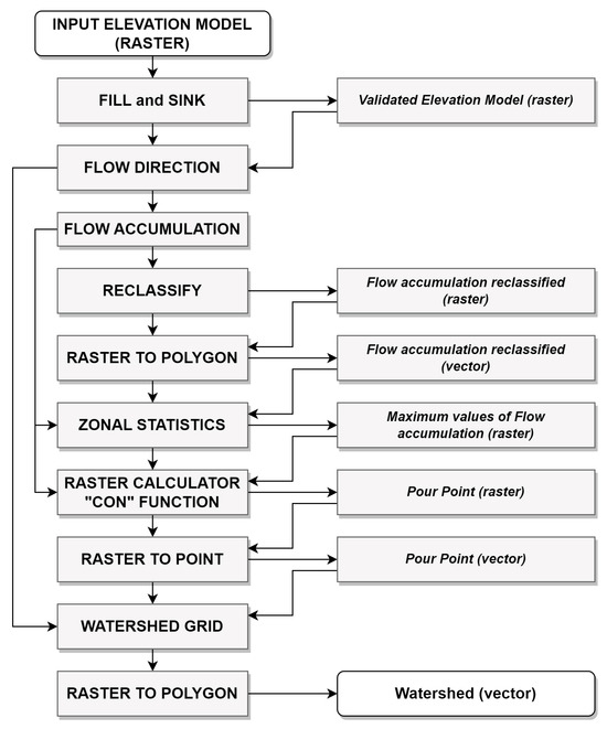 The model has been developed in ArcGIS/ArcMap software (version 10.8), using the model builder module. During recent decades, there have been dozens of variants of hydrological analysis models, with drainage basin level approaches, which intended to provide better and more relevant results for the on-site context: Storm Water Management Model (SWMM) [31], Precipitation-Runoff Modeling System (PRMS) [32], National Weather Service (NWS) River Forecast System [33], Streamflow Synthesis and Reservoir Regulation (SSARR) [34], Systeme Hydrologique Europeen (SHE) [35,36], TOPMODEL [37], Institute of Hydrology Distributed Model (IHDM) [38], etc. [39].