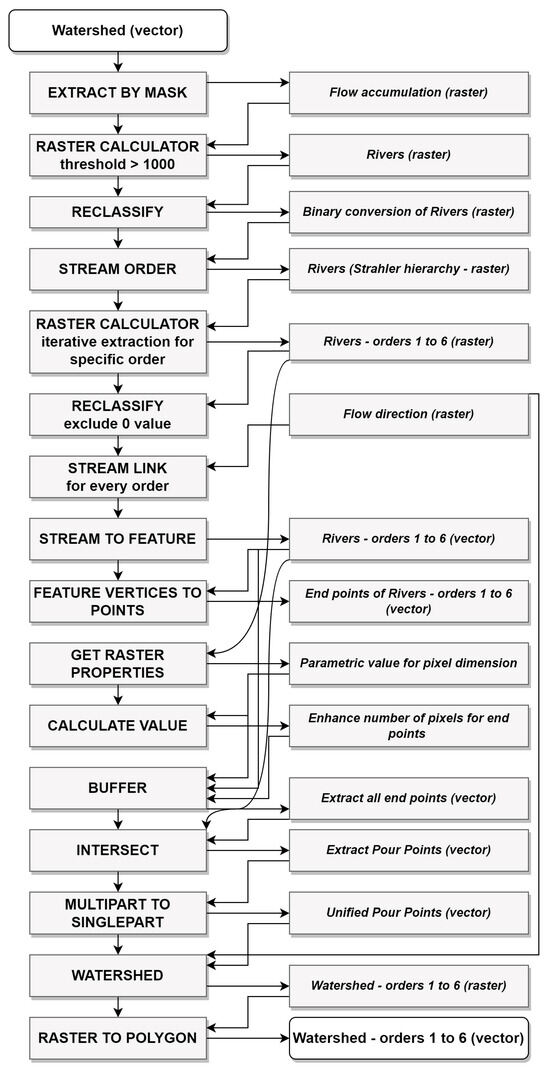 The second stage identifies the smaller drainage basins within the watershed extracted during the first stage, according to the Horton–Strahler hierarchy number, for an order that was chosen by the user, during the initial input of the tool. This is achieved by generating the river network, according to a threshold value, from the flow accumulation raster, followed by generating the Horton–Strahler classification raster, using the stream order function, followed by extracting the pour points from the confluences of the initially specified order value. These pour points become input for the watershed function once again, in order to extract the drainage basins included in the initial, larger basin, corresponding to the specified Horton–Strahler order (Figure 4).