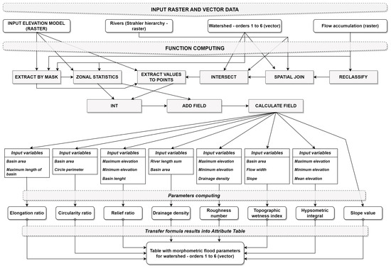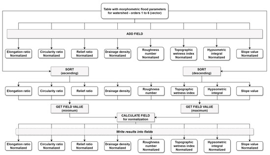 There are numerous factors/parameters that influence the occurrence and manifestation of floods, and several previous studies have combined as many as possible in order to try to identify the most vulnerable areas that are prone to flooding [58,59,60,61]. This current study has applied some of the most relevant parameters for flood analysis, that could be calculated automatically in the model builder. These morphometric parameters are dimensionless in nature, meaning they do not have any measuring units attributed to them, but the minimum–maximum values range successfully depicts the relative comparison between different drainage basins in any hierarchy order.